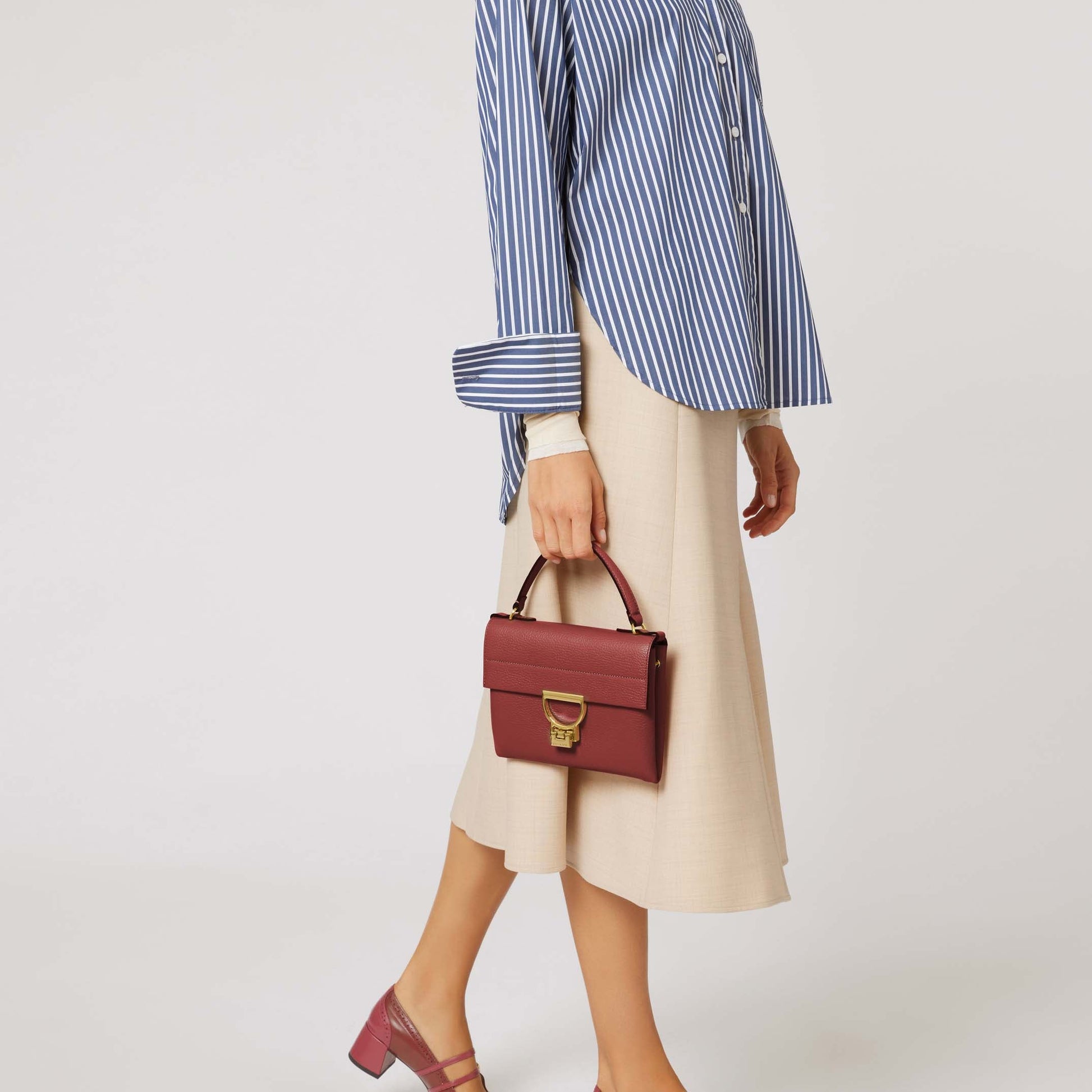 A distinctive feature of the Arlettis line is the fusion of retro and 1970s taste, for an eclectic and feminine woman. The clasp, a graphic reworking of an inverted letter C, provides continuity with Coccinelle’s distinctive elements. Blending modernity and elegance, this new model from the Arlettis line is the perfect epitome of a versatile clutch bag. Equipped with a shoulder strap allowing it to be carried in two ways, it is ideal for every special occasion. This model is made with leather processed using specialised machines and then tumbled to maintain its softness. This is a very robust, easy to clean leather, making it ideal for everyday use.INFORMATIONS ABOUT THE PRODUCT
