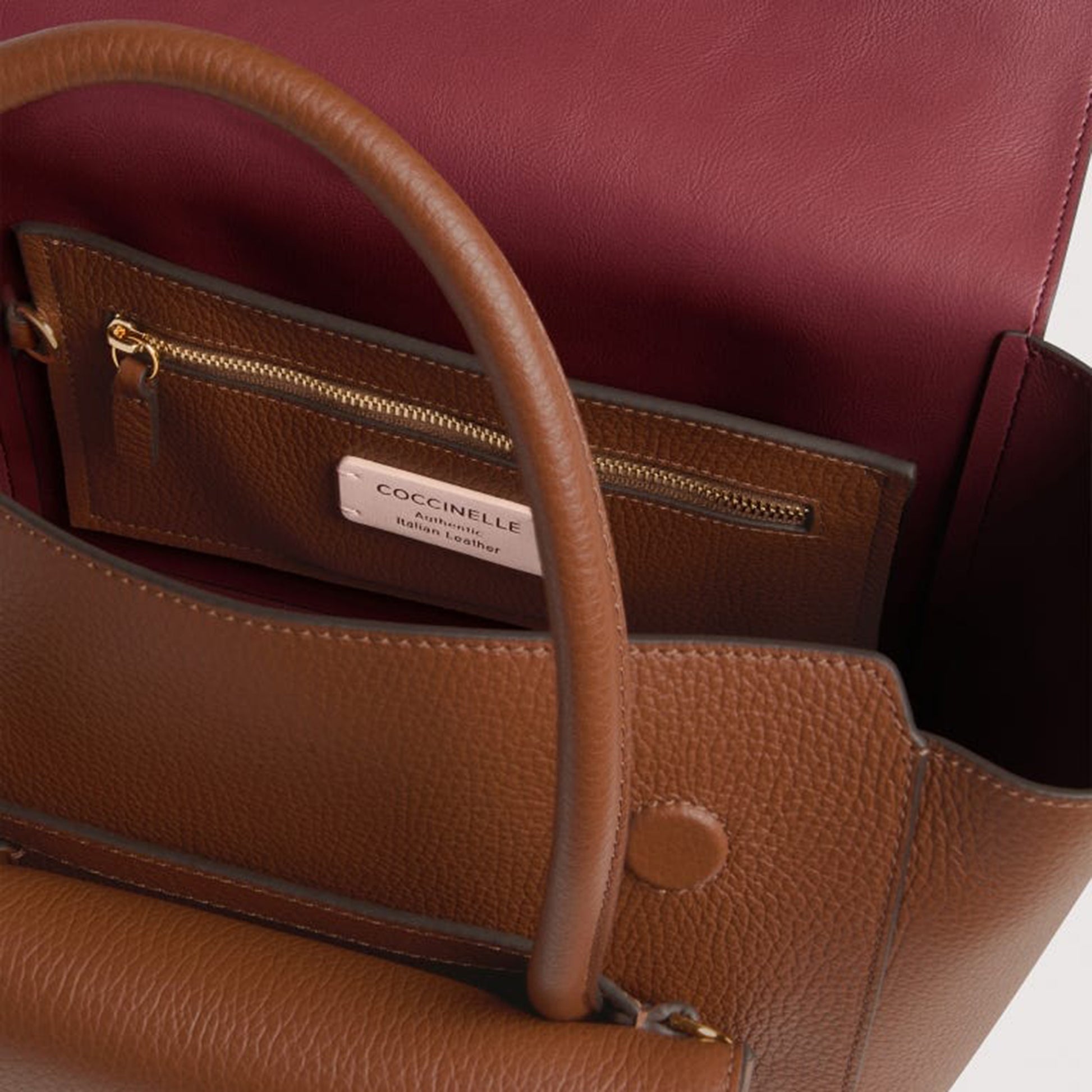 Coccinelle Double Beat is a true daily companion, a spacious flap bag designed to be worn either on the shoulder or crossbody, thanks to its tubular handles and adjustable, comfortable strap. Featuring an innovative design, the front pocket is detachable and can be transformed into a versatile pouch or an elegant clutch, perfect for special occasions. The pocket also stands out as a signature element of the Coccinelle identity, marked by the iconic plectrum detail. This model is made with leather processed using specialised machines and then tumbled to maintain its softness. This is a very robust, easy to clean leather, making it ideal for everyday use.INFORMATIONS ABOUT THE PRODUCT