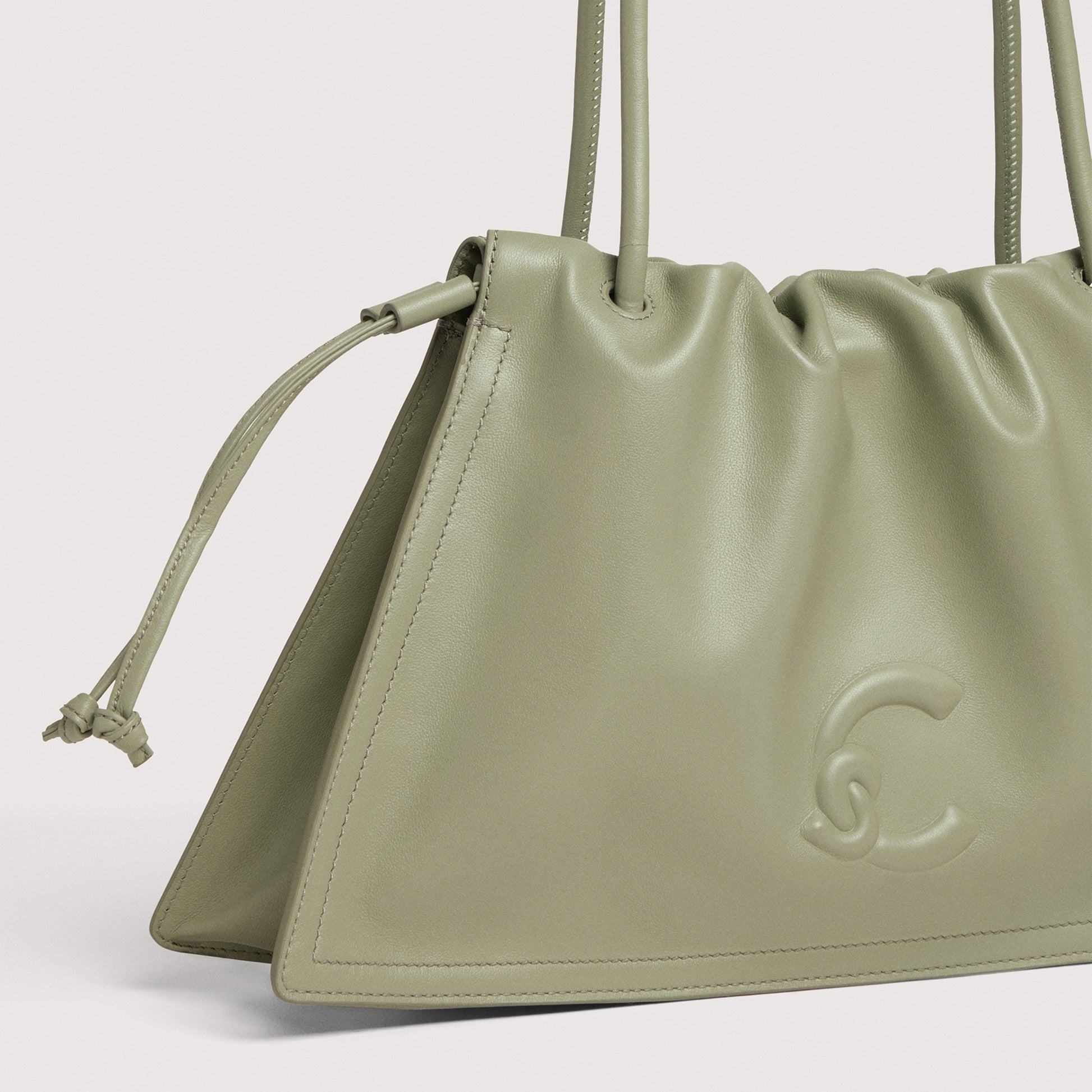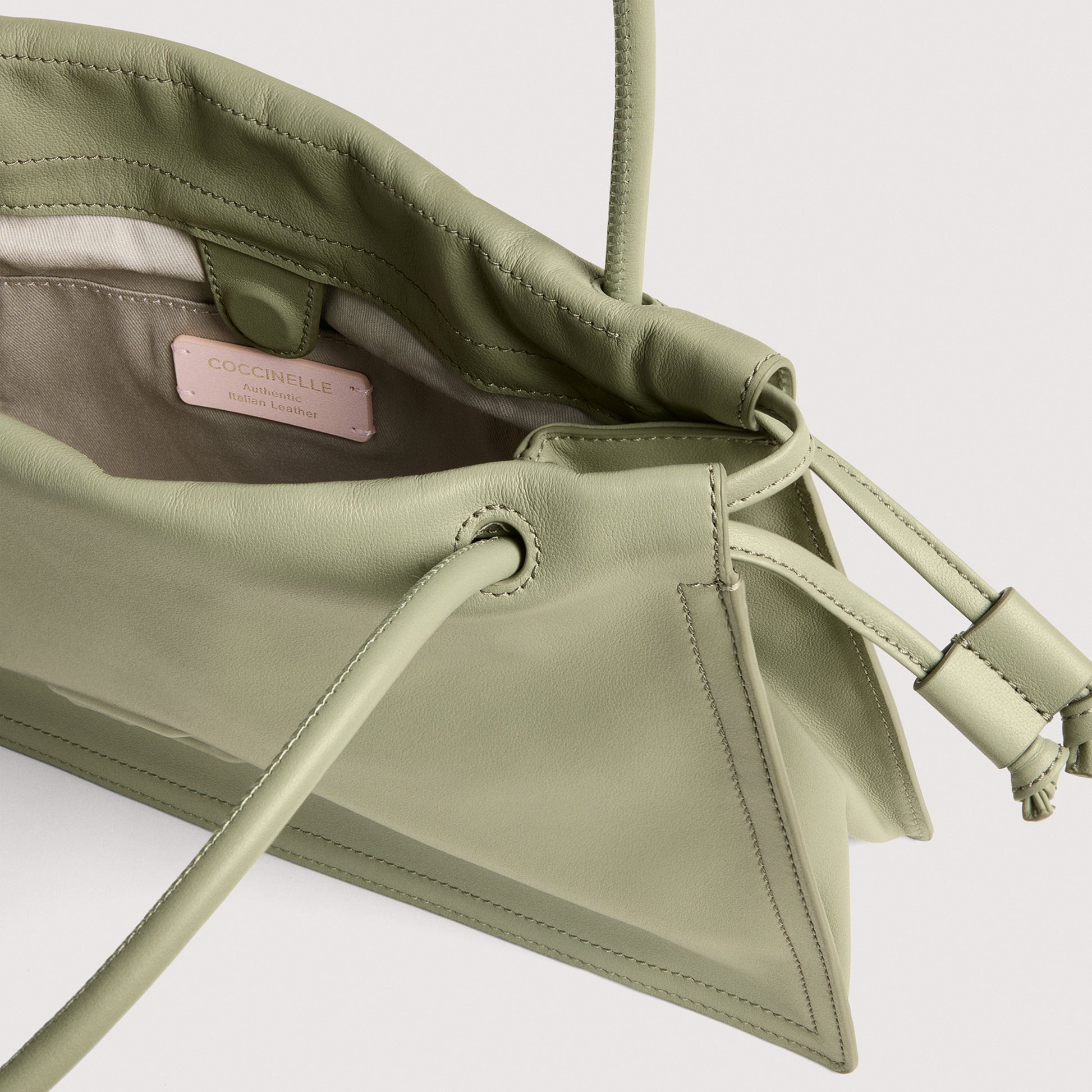 กระเป๋ารุ่น Coccinelle Dulse ผลิตจากหนังเรียบ เพิ่มความหรูหราด้วยการจับจีบที่นุ่มนวล เชือกผูกหนังช่วยโอบอุ้มกระเป๋าใบใหญ่ใบนี้ให้เต็มใบด้วยดีไซน์ที่หรูหราและโรแมนติก จุดเด่นของกระเป๋ารุ่นนี้คือโลโก้ C-Me ใหม่ ซึ่งผลิตขึ้นด้วยกระบวนการปั๊มนูนพิเศษบนหนัง รุ่นนี้ผลิตจากหนังเรียบและนุ่มที่ฟอกด้วยไขมันและน้ำมันพิเศษเพื่อให้สัมผัสนุ่ม การเคลือบผิวช่วยให้รูปลักษณ์ดูสม่ำเสมอและนุ่มนวลขึ้น การตกแต่งด้วยเรซินช่วยให้ทนทานต่อสารก่อภูมิแพ้ในอากาศ