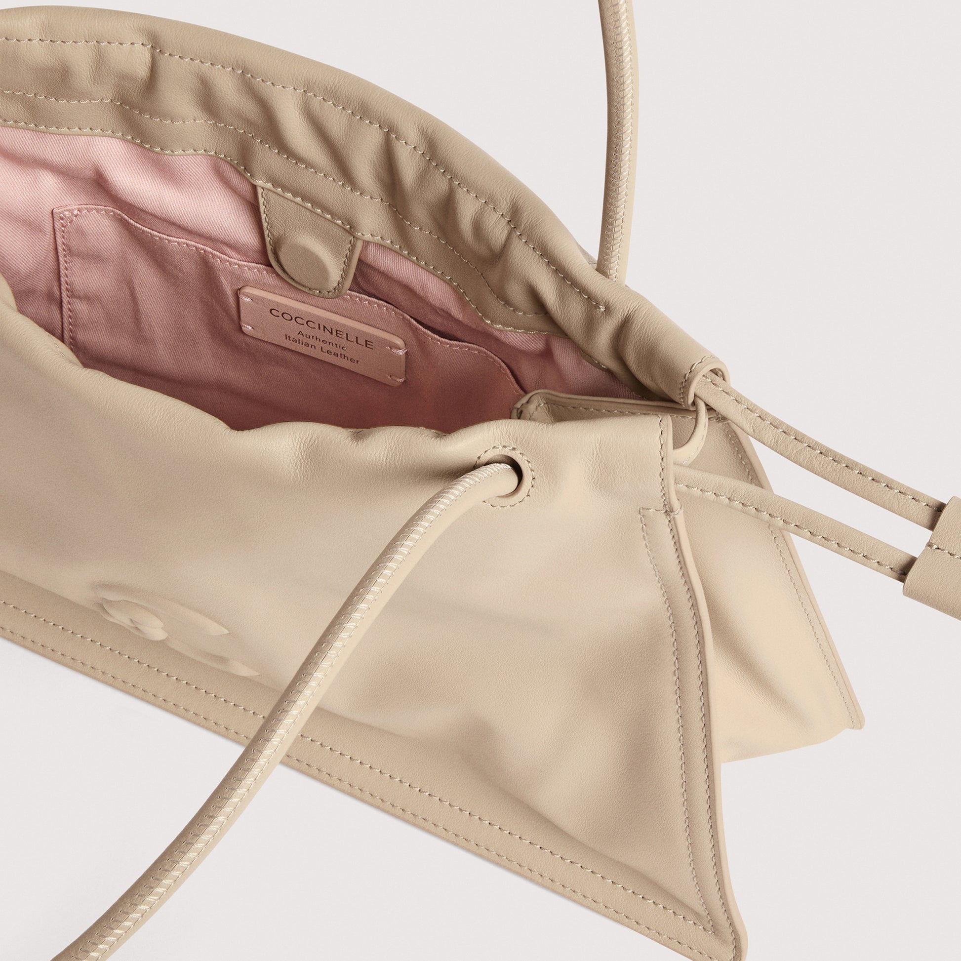 ผลิตจากหนังเรียบ ไลน์ Coccinelle Dulse เน้นความหรูหราของวัสดุด้วยการจับจีบที่นุ่มนวลโดดเด่น เชือกรูดหนังรวบรวมรูปทรงที่กว้างขวางของกระเป๋าเหล่านี้ ผสมผสานความกว้างขวางเข้ากับเสน่ห์ที่หรูหราและโรแมนติก เส้นสายโดดเด่นด้วยโลโก้ C-Me ใหม่ ซึ่งสร้างขึ้นโดยใช้เทคนิคการพิมพ์ลายนูนอันเป็นเอกลักษณ์บนหนัง รุ่นนี้ทำจากหนังเรียบฟอกด้วยน้ำมันพิเศษที่ให้สัมผัสนุ่ม แม้จะมีรูปลักษณ์ที่นุ่มนวล แต่หนังก็ทนทานต่อสภาพอากาศด้วยการใช้เรซินที่ทำให้หนังกันน้ำได้เล็กน้อยแต่ยังคงรูปลักษณ์ที่เป็นธรรมชาติไว้รายละเอียดสินค้า