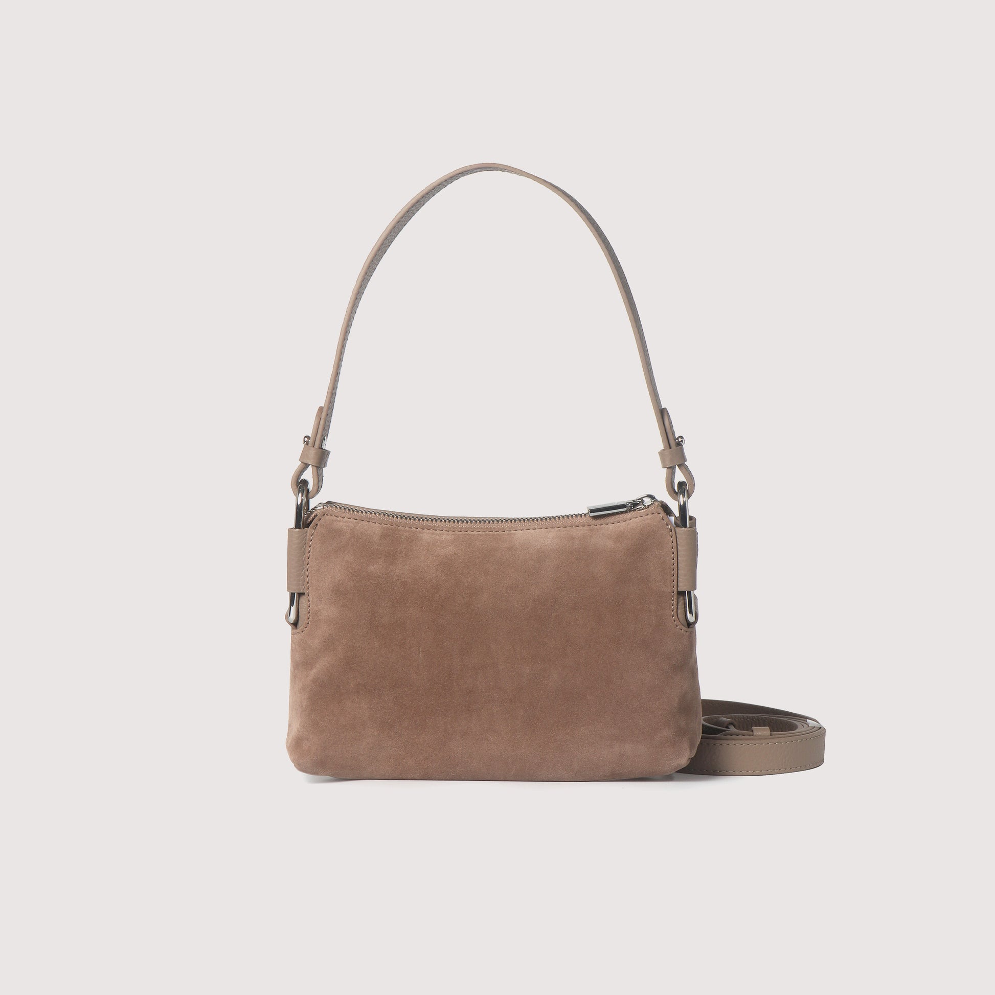 Ccrossbody portability Suede Zip closure Removable handle for shoulder carry Additional removable and adjustable shoulder strap with cufflinks for crossbody carry Side plectrum detail Fabric lining Light gold plating Gold stamp logo In order to best preserve this product, it is advisable to be careful about using overly aggressive detergents or sanitising gels that could ruin the accessories with which they come into direct contact Dimension: 23X16X5cm - 500 g REF: E5 T96 52 01 01 N59- Size : 23X16X5 CM.