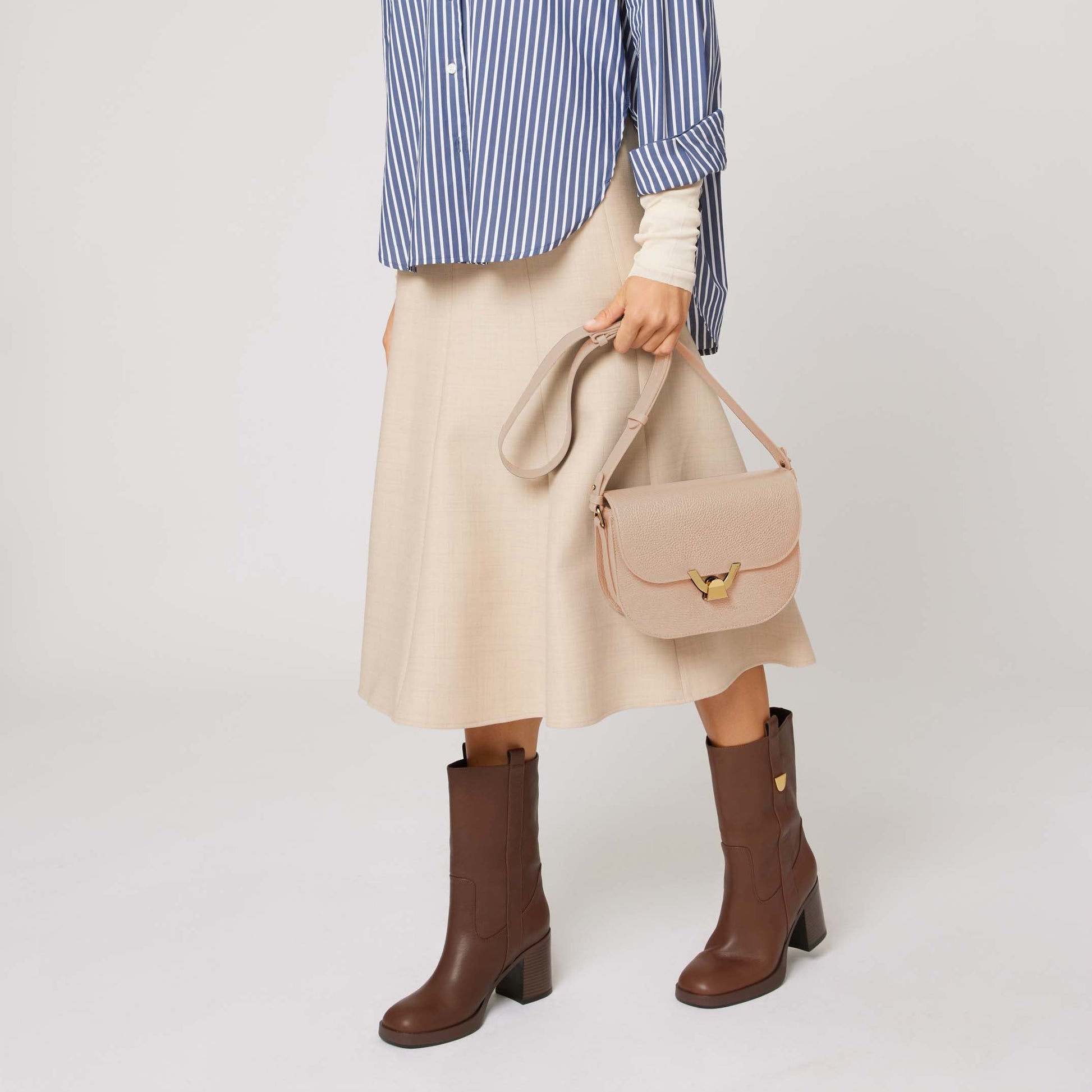 กระเป๋าทรงกล่องจากกลุ่ม Coccinelle Dew ที่ต้องมีมีดีไซน์ที่มีโครงสร้างแต่มีลูกเล่นที่ประณีต จุดเด่นที่โดดเด่นของแบรนด์สามารถพบได้ในเส้นโค้งที่ดูเป็นผู้หญิง ในขณะที่คุณสมบัติใหม่คือการปิดฝาที่โดดเด่นด้วยการทำงานร่วมกันที่ทับซ้อนกันของปิ๊กอันเป็นเอกลักษณ์รายละเอียดสินค้า