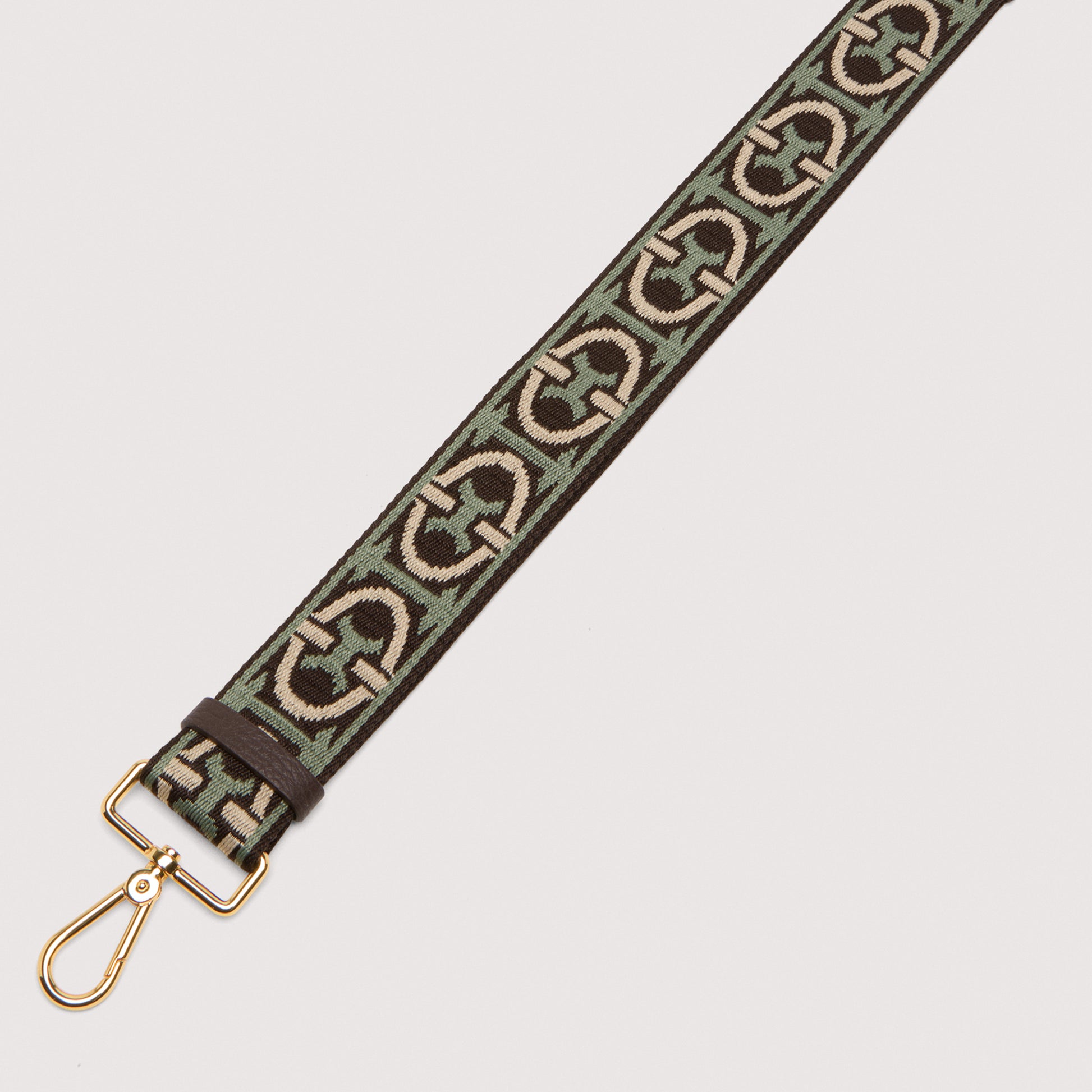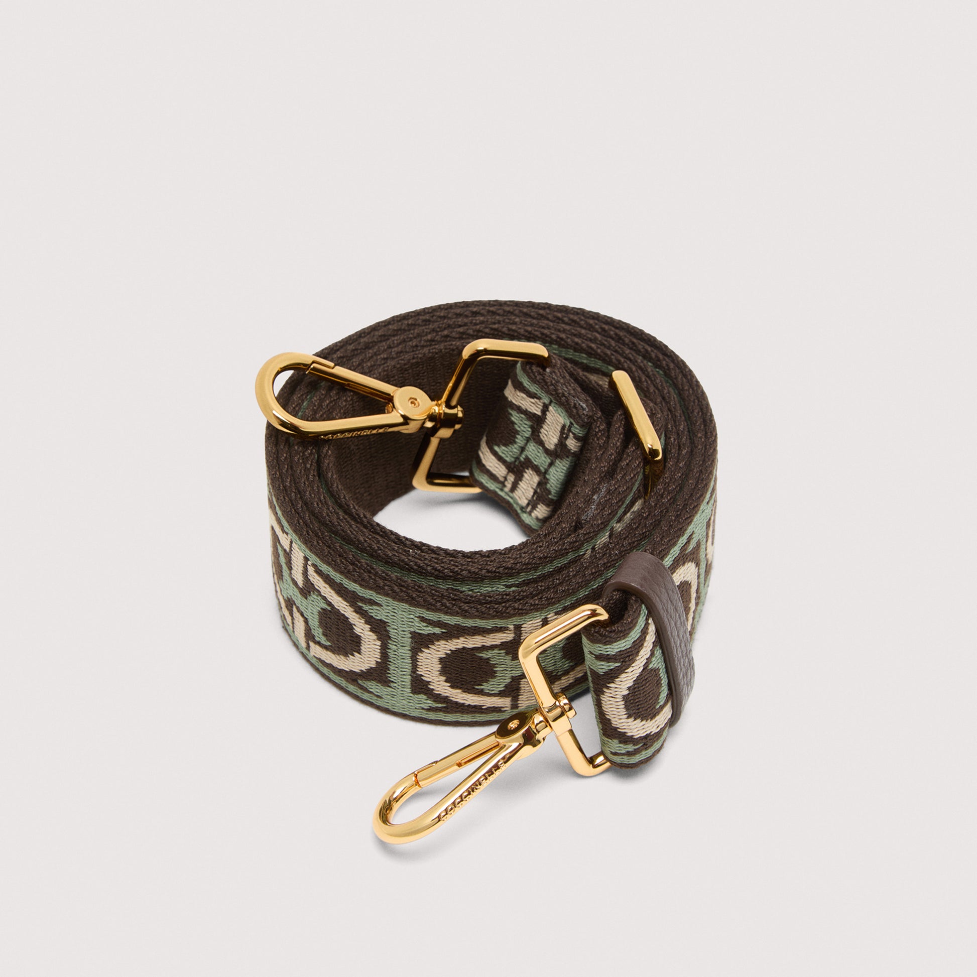 สายสะพายผ้า Jacquard ลาย Monogram Coccinelle ปรับได้ด้วยวงแหวนเลื่อน เหมาะสำหรับปรับแต่งกระเป๋าของคุณ รุ่นนี้ตัดเย็บจากผ้าคอตตอน 100% ผ้าแจ็คการ์ดโมโนแกรมผลิตโดยใช้เครื่องทอแบบพิเศษที่สามารถออกแบบที่ซับซ้อนได้ เมื่อเสร็จแล้ว ผ้านี้จะได้รับการประมวลผลเพิ่มเติม และมีน้ำยาป้องกันการหลุดลุ่ยที่ด้านหลัง และน้ำยาป้องกันน้ำหยดที่ด้านที่มองเห็นได้ ทำความสะอาดด้วยผ้าฝ้ายสีขาวชุบน้ำเล็กน้อยแล้วทิ้งไว้ให้แห้ง